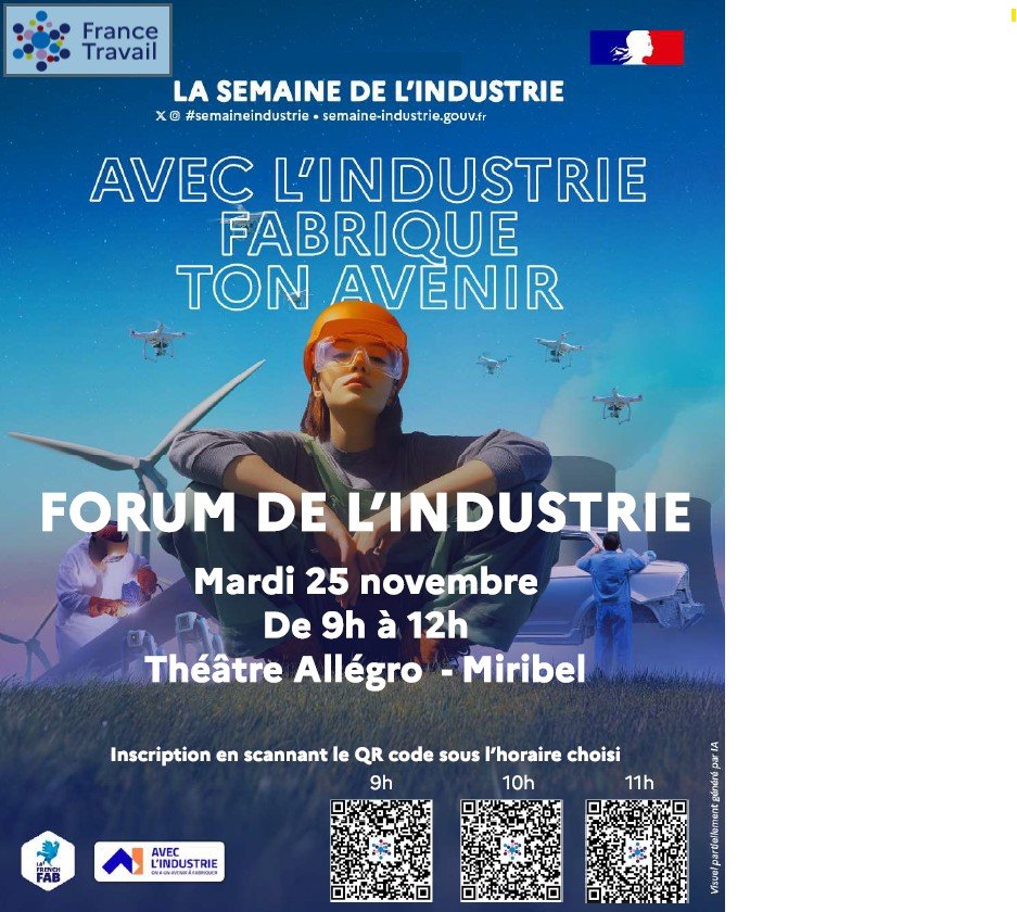 France Travail Montluel organise dans le cadre de la semaine de l’industrie eson forum industrie le mardi 25 novembre de 9h à 12h à l’Allegro à Miribel.