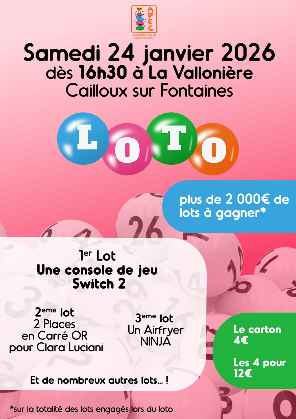 Ce samedi, les parents bénévoles de l'APEC vous propose un loto à la Vallonnière à partir de 16h30.