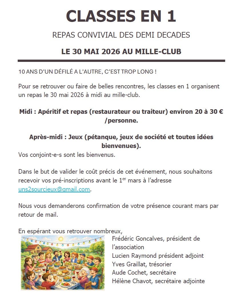 Pour se retrouver ou faire de belles rencontres, les classes en 1 organisent un repas le 30 mai 2026 à midi au mille-club.